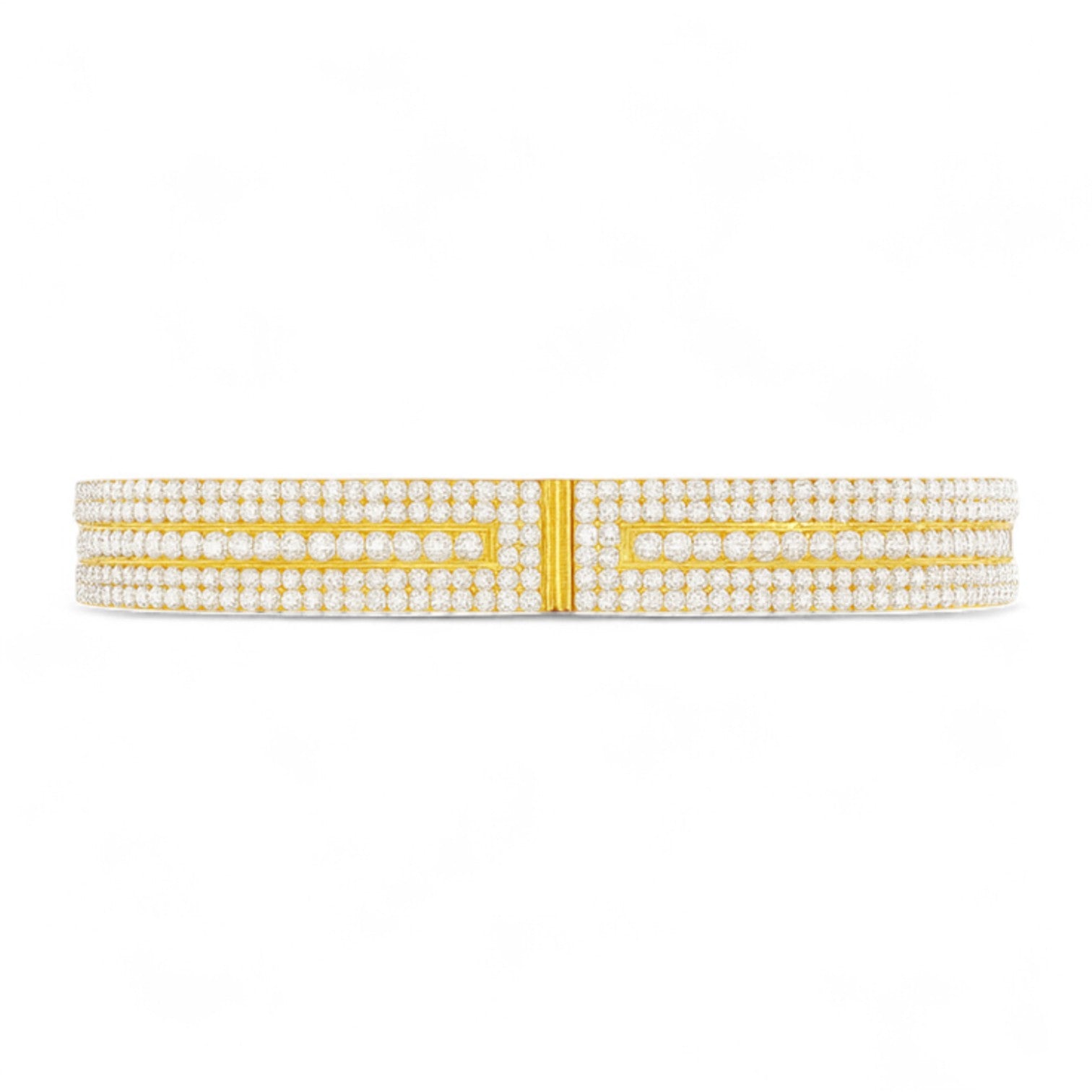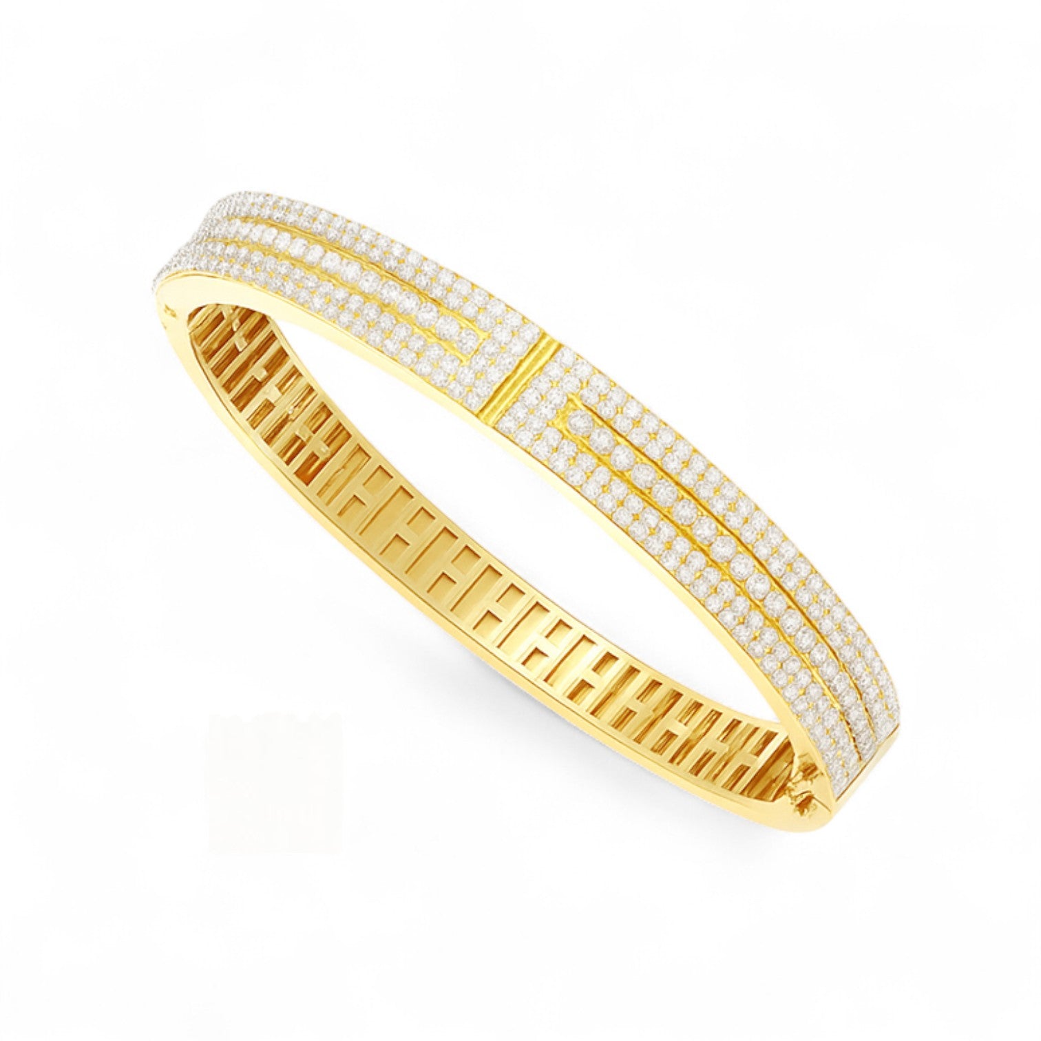 This luxurious bangle features three rows of glittering diamonds, designed to create a bold and radiant statement. Available in 9k, 14k, 18k gold, and silver, it embodies elegance and grandeur. With its timeless design, it is perfect for weddings, parties, and special celebrations. A must-have piece for those who love to shine with sophistication. Fully customizable in all metals, diamond qualities, and finishes.